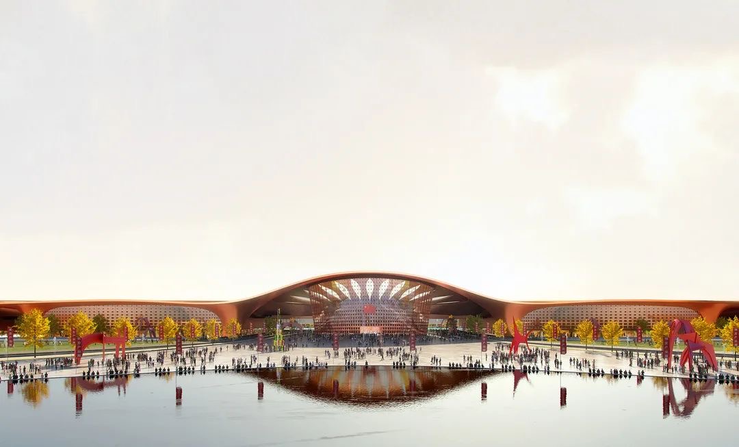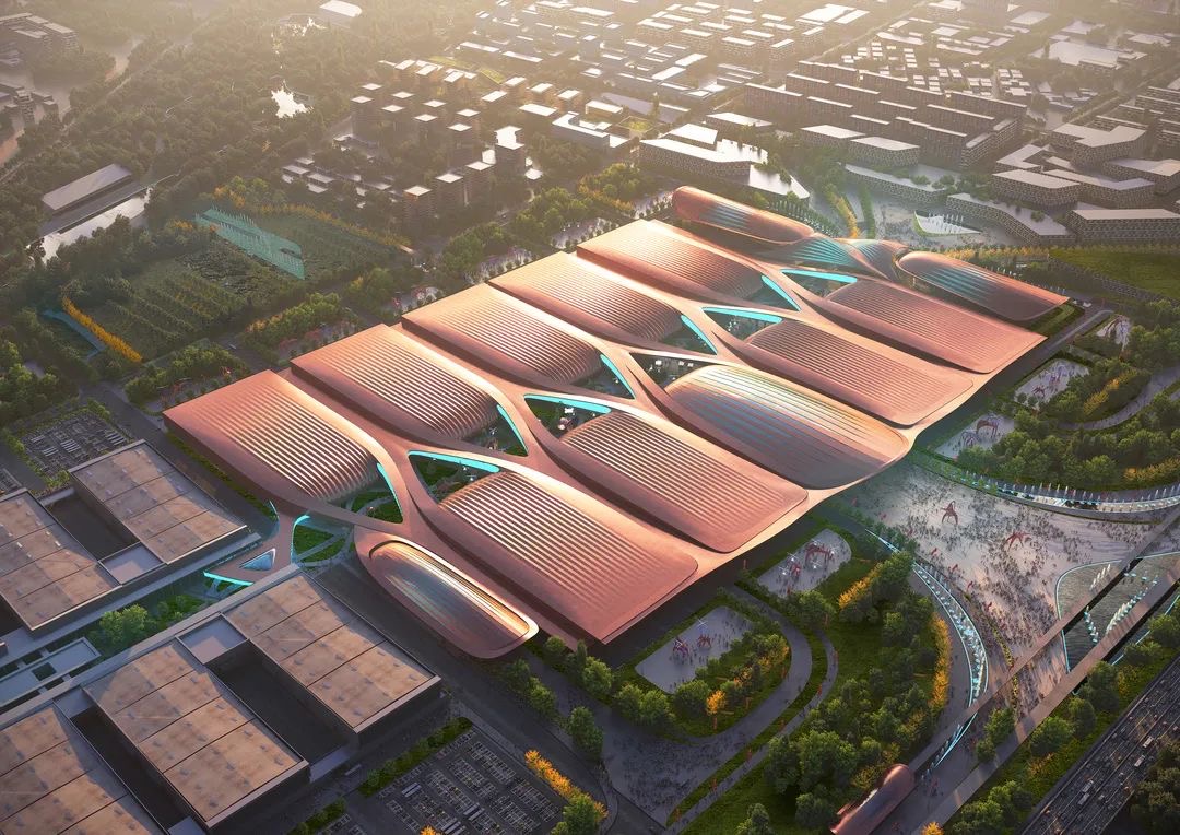 項(xiàng)目總體布局延續(xù)一期的中軸模式,在中軸線上設(shè)置了南、北登錄廳、展覽序廳以及連接會議酒店和新國展一期的景觀連廊。項(xiàng)目建筑設(shè)計(jì)精巧,造型借鑒故宮博物院琉璃瓦的經(jīng)典中國元素,將精致復(fù)雜的傳統(tǒng)元素完美地融入在建筑的紋理組織之中,彰顯首都?xì)赓|(zhì)。優(yōu)雅綿密的線條交織于各個(gè)展廳之間,寓意著信息時(shí)代知識的鏈接與共享。